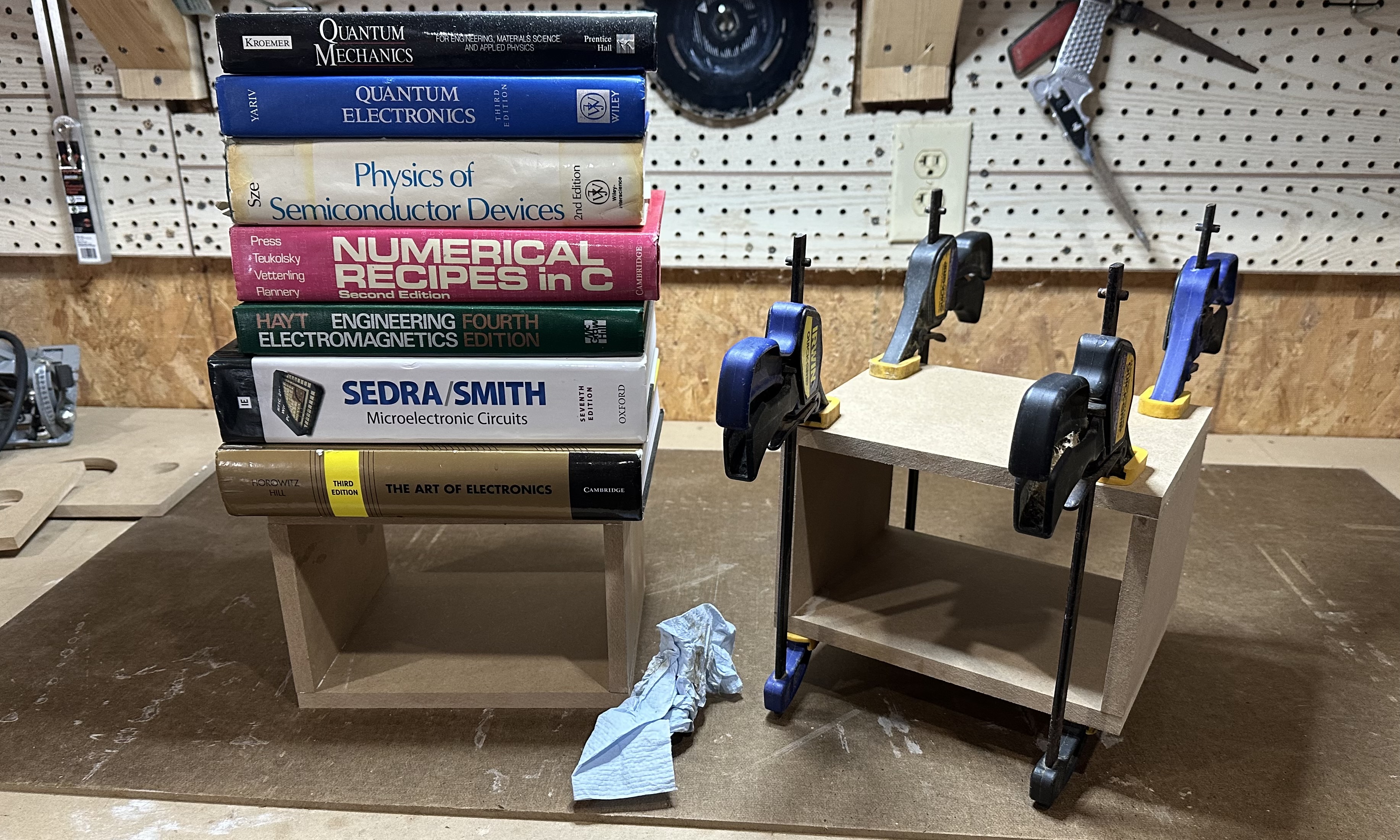 Many things can be used as a weight while the glue dries: a few books as shown here, a gallon jug of water, a couple of bricks, a dumbbell, an oscilloscope, a sleeping roommate. Eight to ten pounds (4 to 5 kilos) of weight should be adequate.