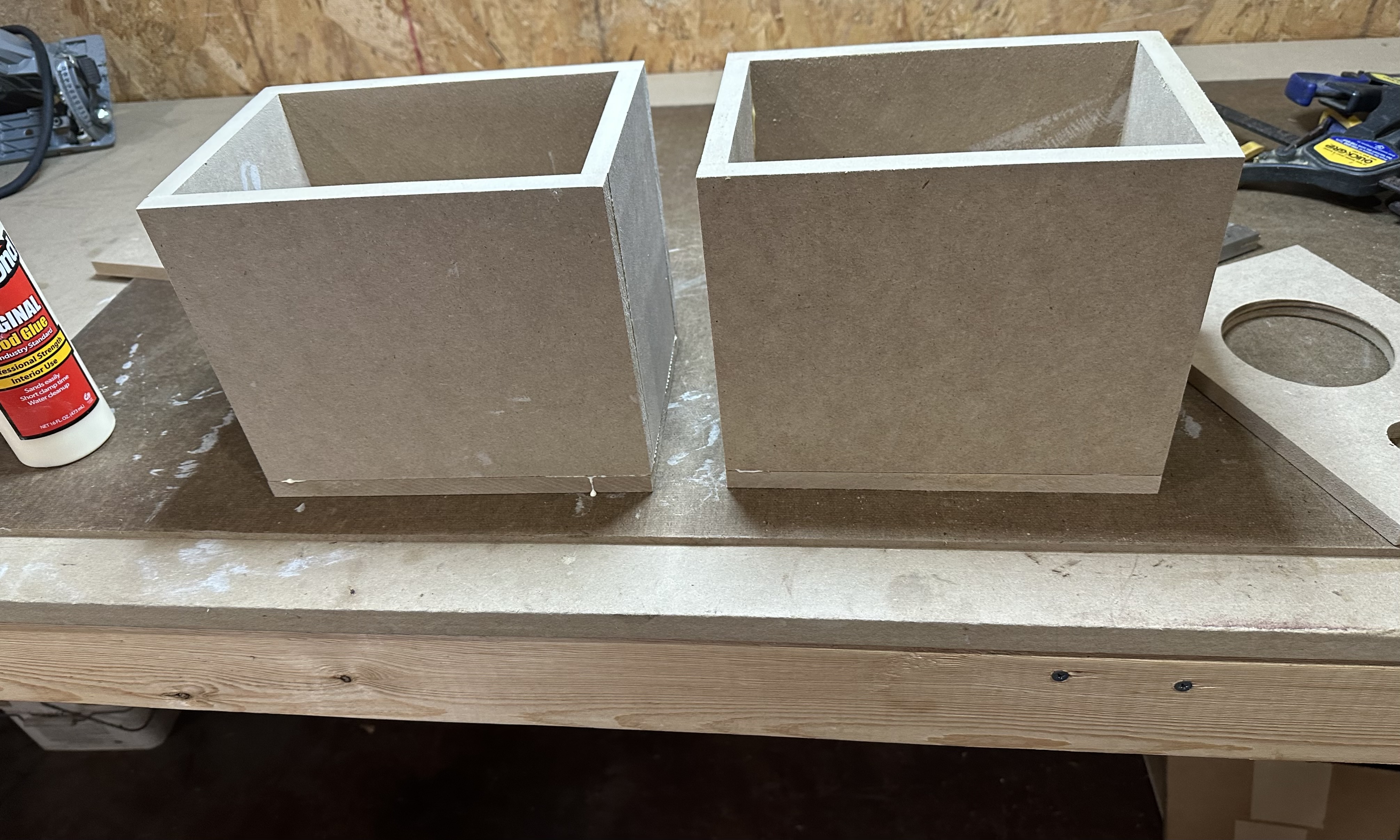 The speaker project requires two identical speaker boxes. Probably the best approach for the inexperienced is to do them one at a time rather than in parallel. The text of the instructions below is written with the assumption that the two boxes are being done sequentially. However, the photos show the two boxes being at the same time in order to show the use of both weights (in the form of a stack of text books) and clamps to hold the boxes together as the glue dries.