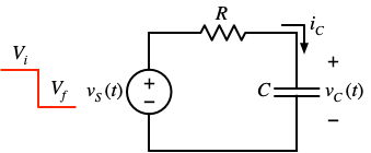 For the RC circuit, the source voltage has been at an initial voltage of Vi = 13 V for a long time. At t = 0, the source voltage abruptly drops to Vf = 0 V.