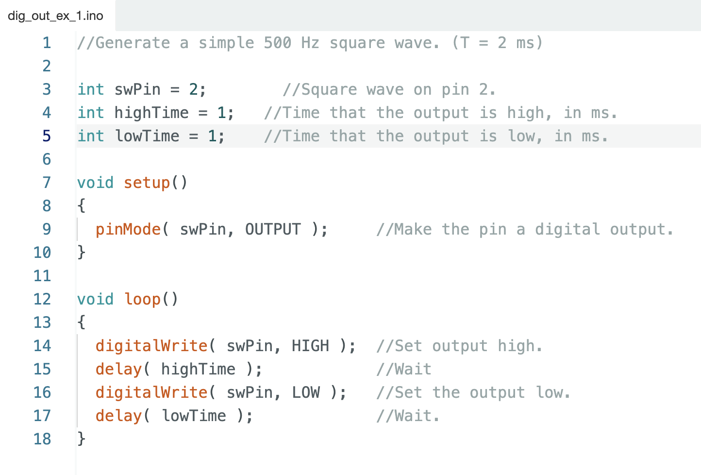 It is easy to set up a square-wave output with low and high levels of 0 V and 5 V, and low and high times that are set using the delay function. The code below generates a square wave with the output high for 1 ms and then low (0 V) for 1 ms, so that the total period is 2 ms ( f = 500 Hz).