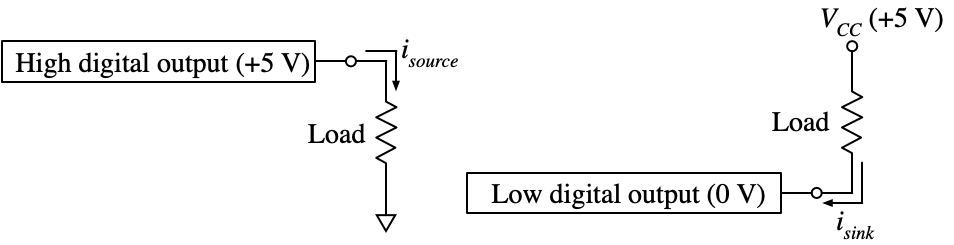 First, we should understand that current can flow out of the pin (sourcing) or into the pin (sinking). Sourcing occurs when the digital output is high and there is a current path through some external components to ground. Sinking occurs when the digital output is low, and there is a current path from the positive power supply through the pin. The two situations are illustrated in the figure below, where resistors are representative external components.
