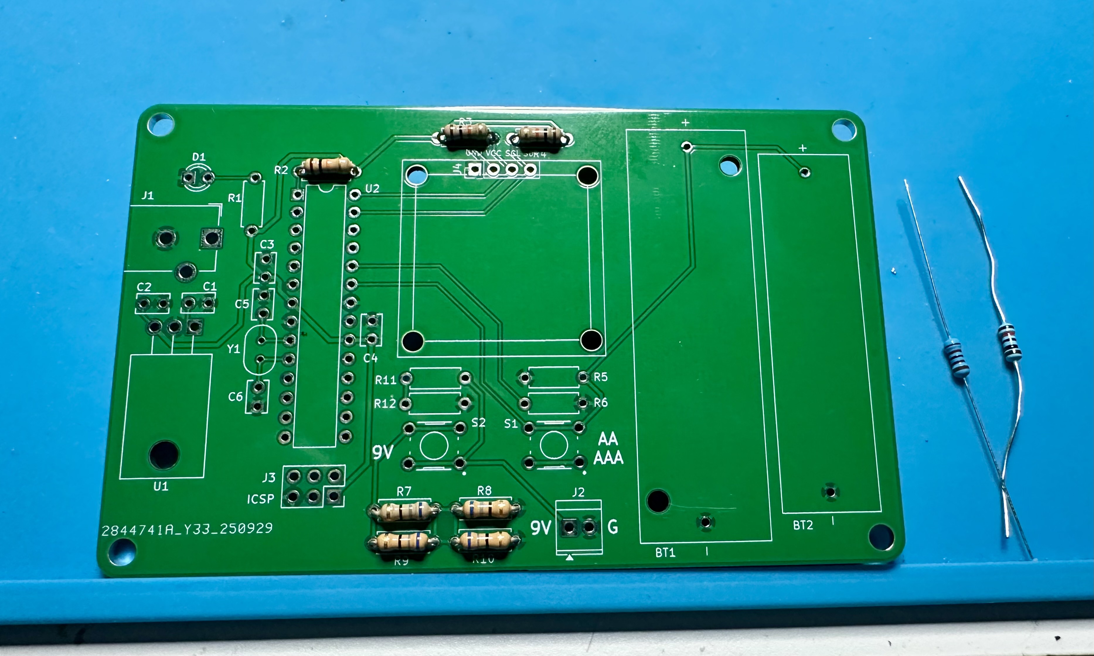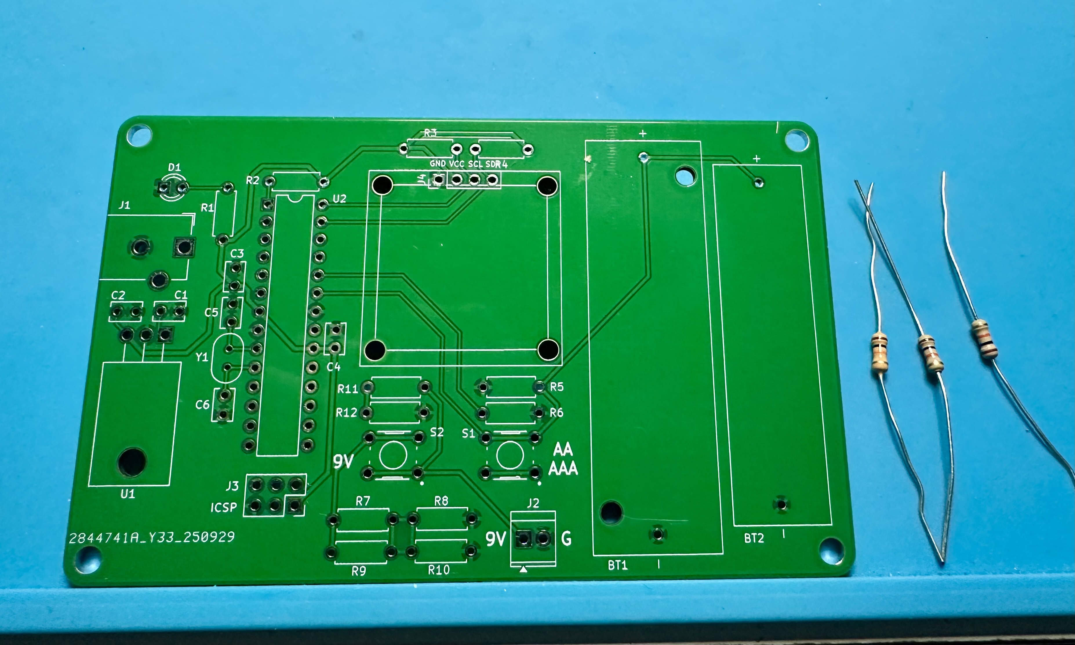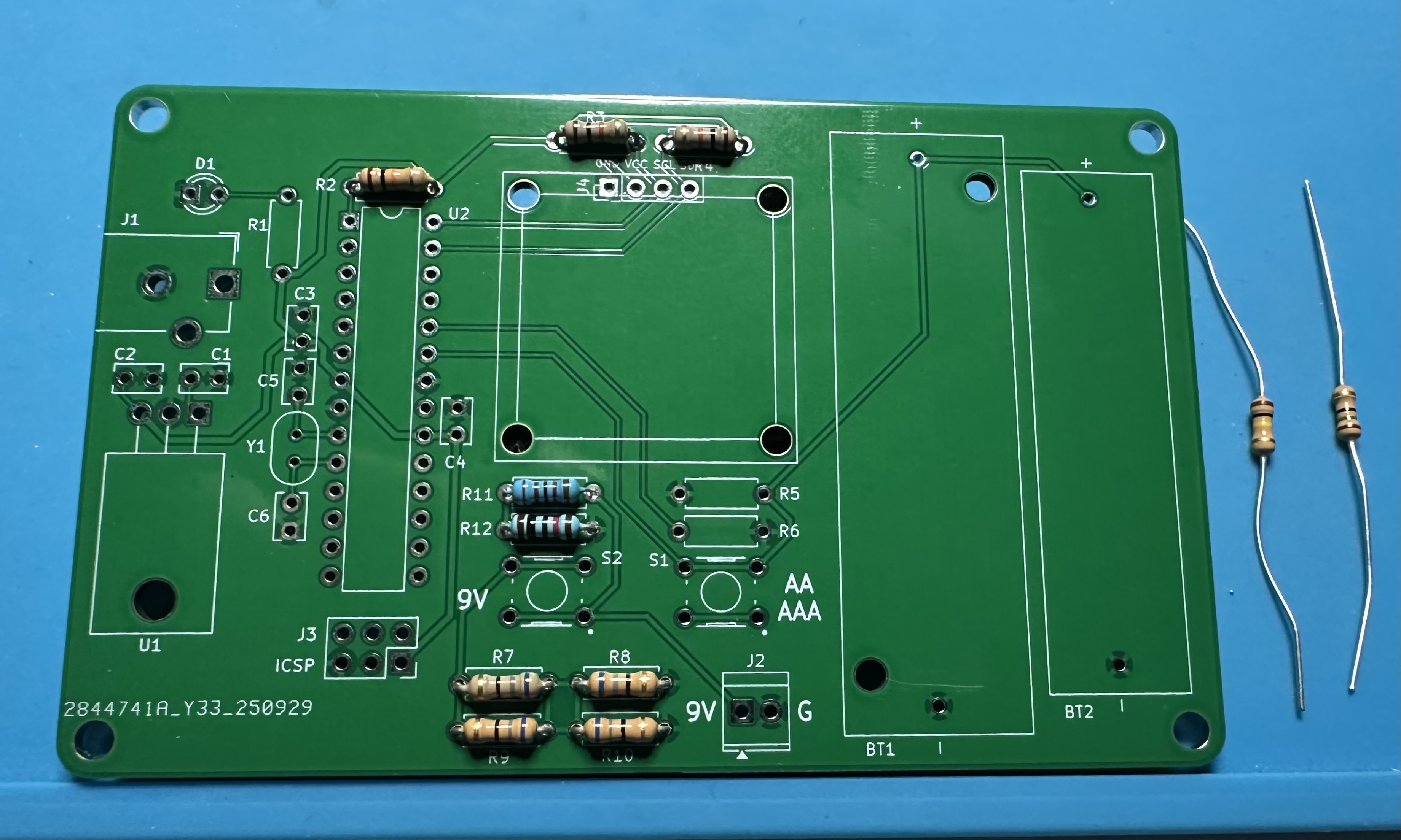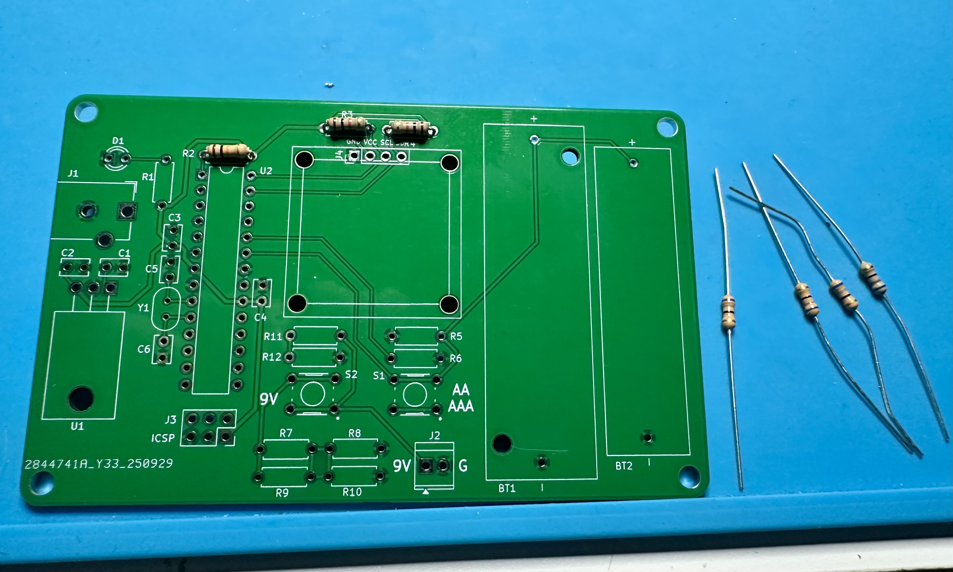 - As usual, we start small and work our way to the bigger parts. The three 10-kΩ resistors (5%, brown-black-orange) resistors are easy to do. Two are pullups for the I2C serial communications channel (R3 and R4 — the R4 label is partly obscured) and one is the pullup for the Atmega reset (R2).
