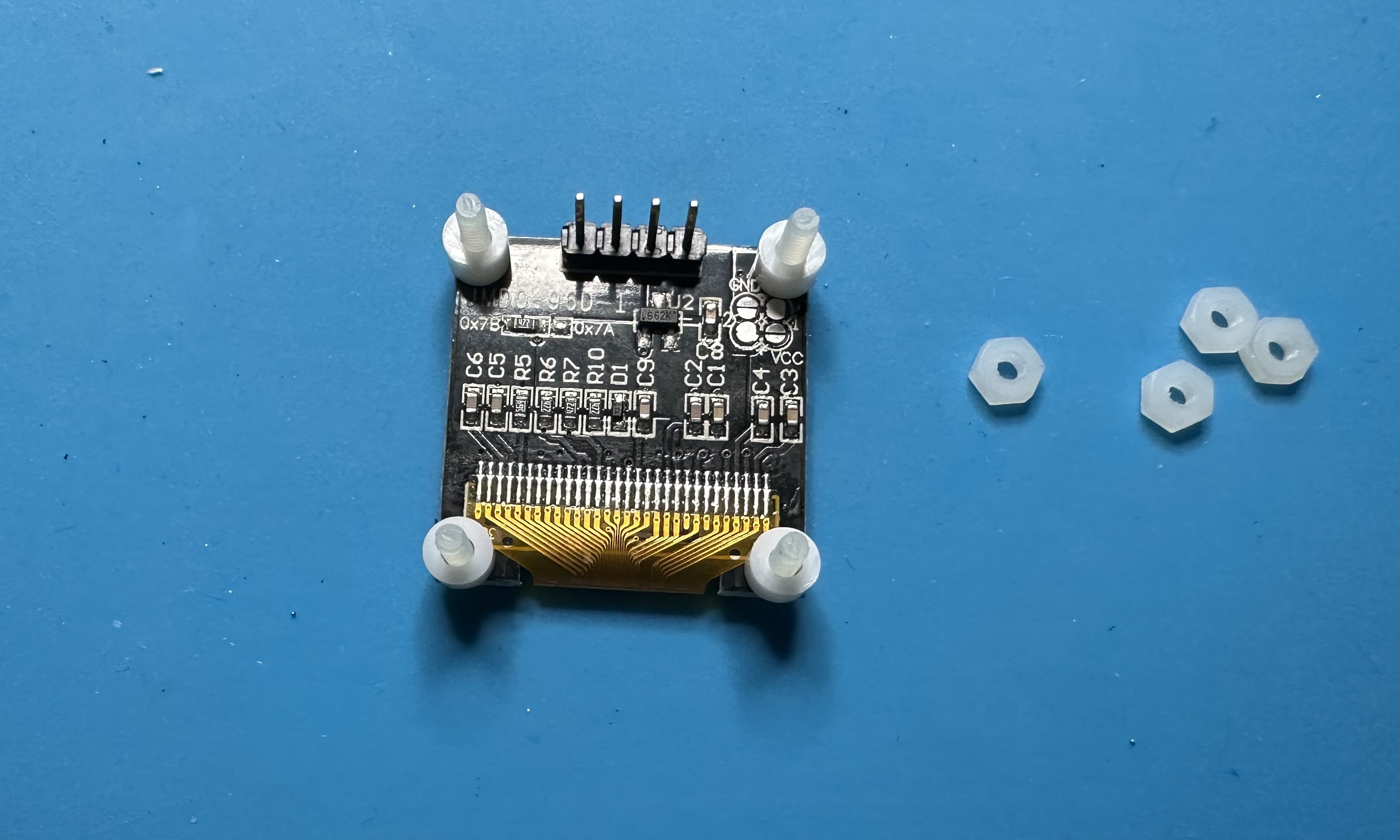 - We are redy to attach the OLED display and solder it in place. Suggested approach: Push all four of the nylon screws through the holes of the OLED board. It's a tight fit and you will need to apply a bit of force to get the screws through. (It will be OK!) Then turn the display over and put the four spacers on the screws. Next turn the PCB over and guide the four holes over the screws. Secure the OLED to the board by thread four nuts onto the screws — use a screw driver to tighten everything up. Finally, solder in the four pins for the display.