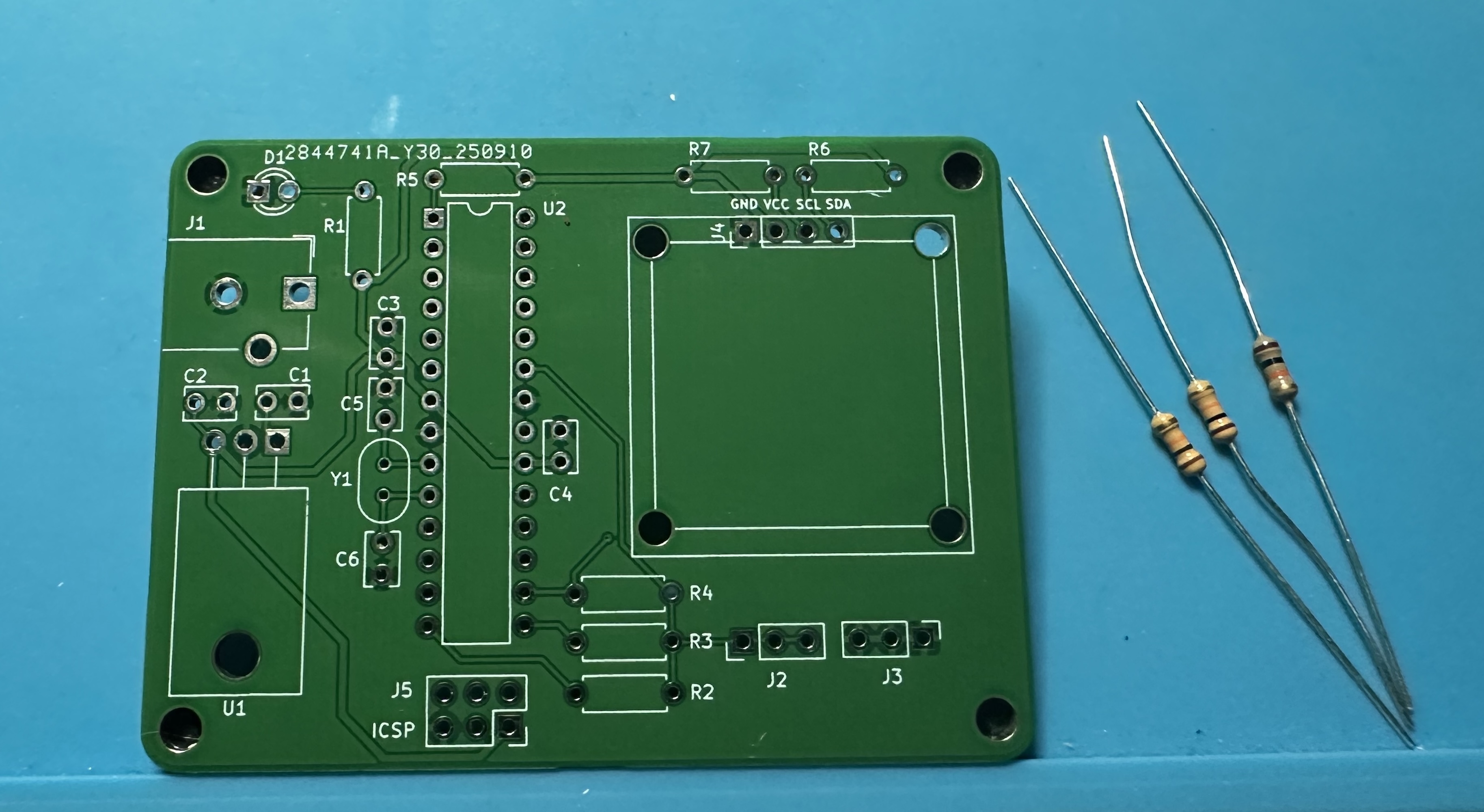 - As usual, we start small and work our way to the bigger parts. The three 10-kΩ resistors (brown-black-orange) resistors are easy to do. These are 5% tolerance resistors. Two are pullups for the I2C serial communications channel (R6 and R7) and one is the pullup for the Atmega reset (R5).