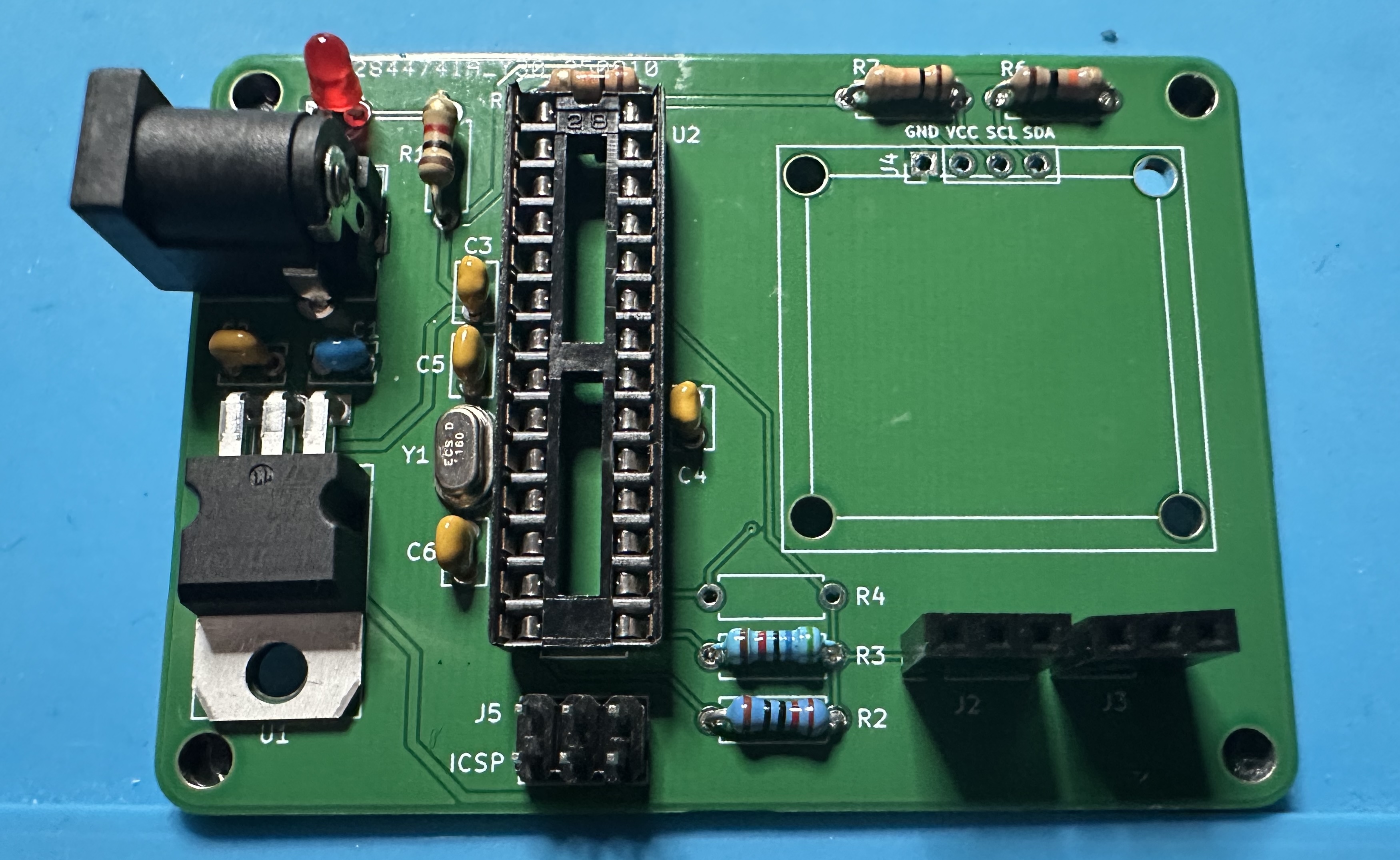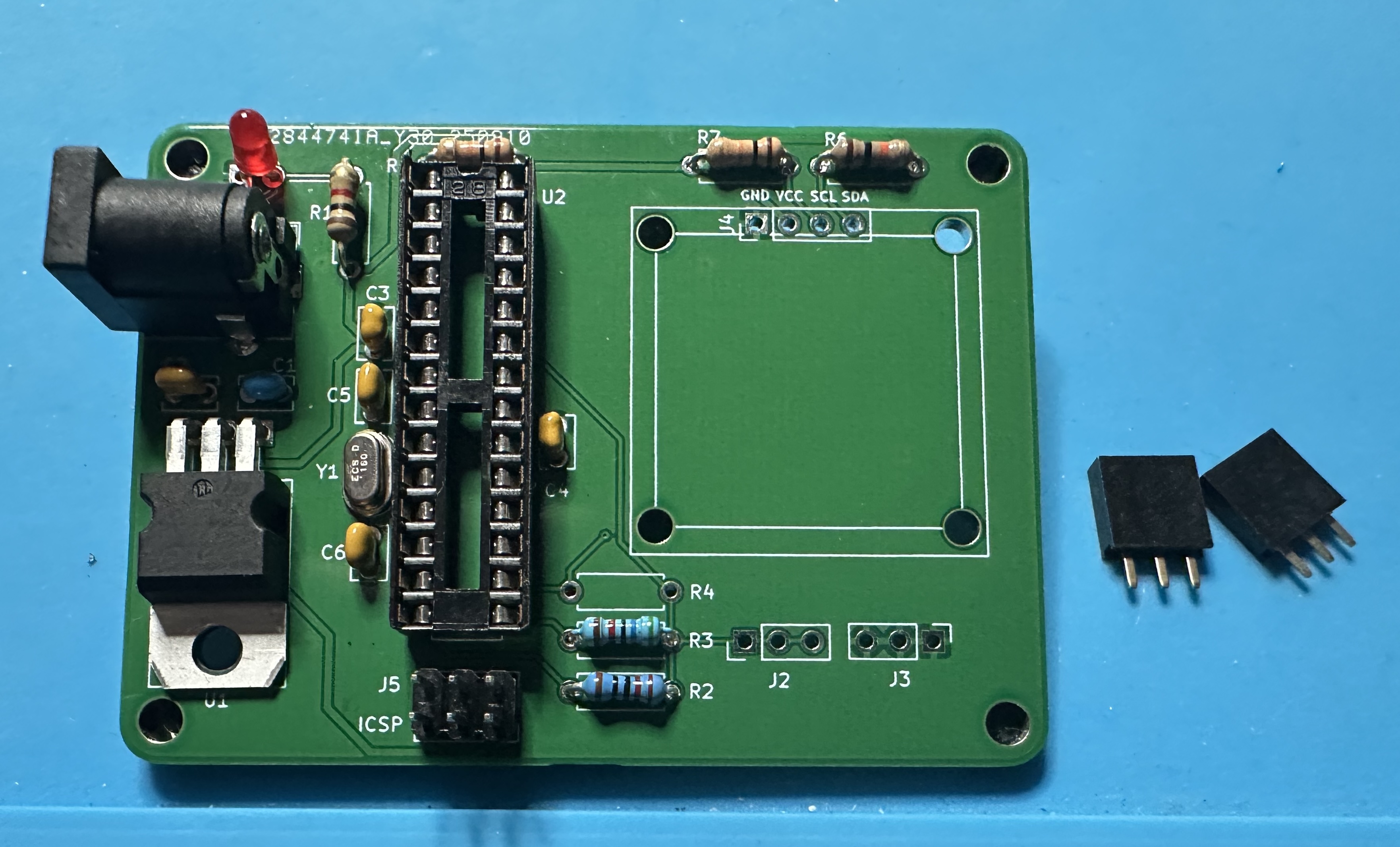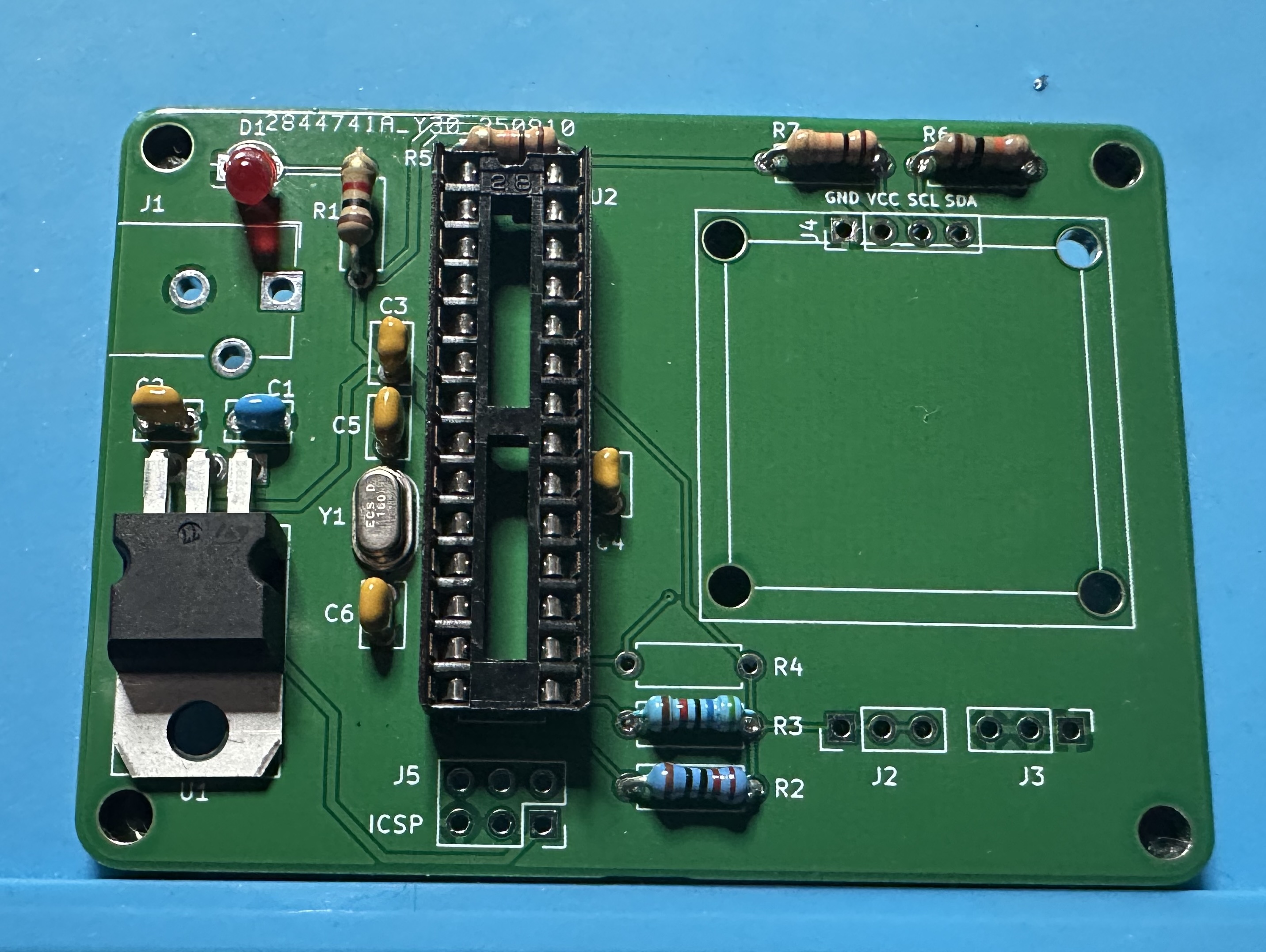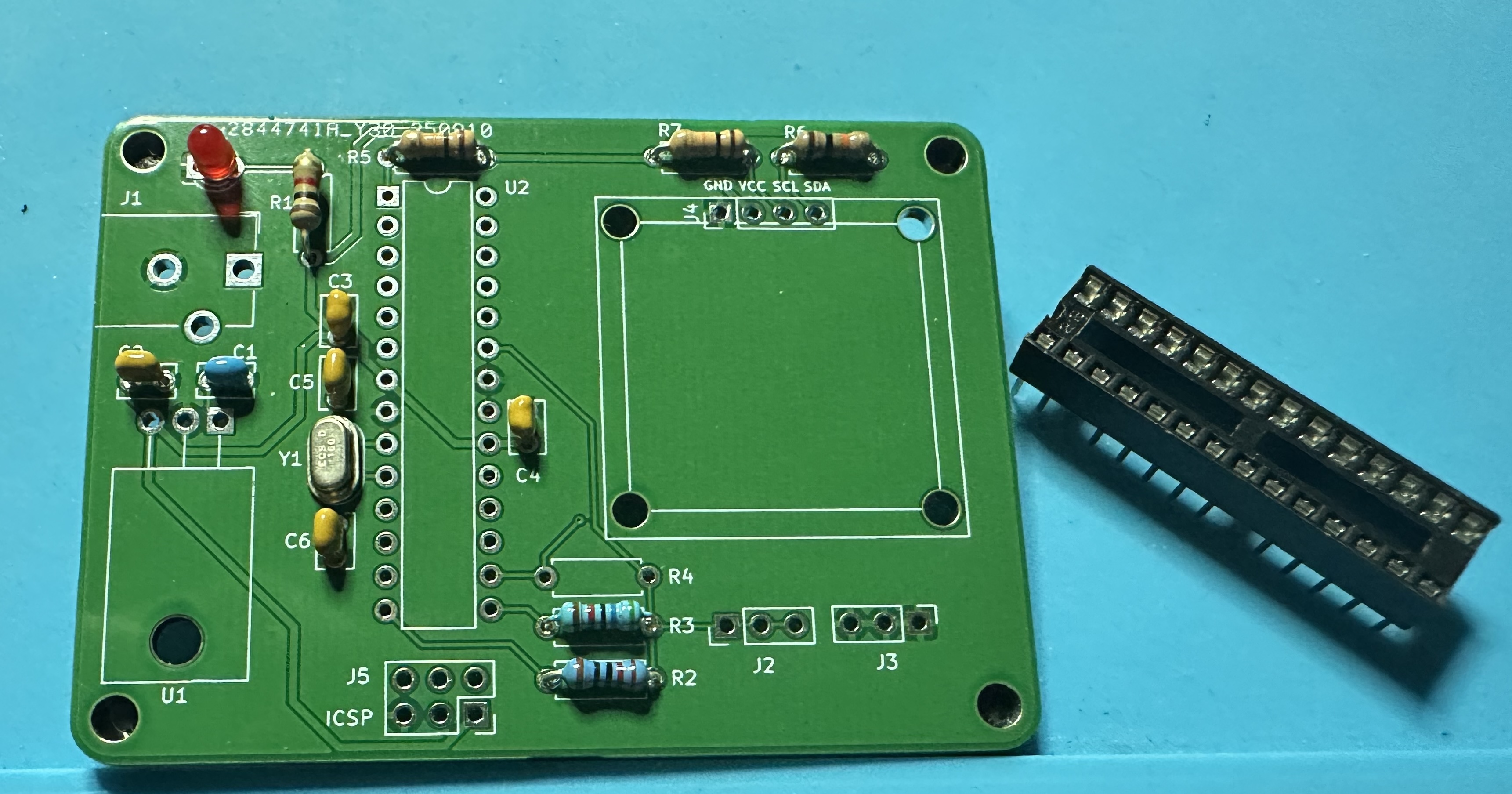 - Next up, add the chip socket — (U2) for the Atmega chip. This one is tedious — 28 pins. Solder one pin and check the alignment. Then take a deep breath and start soldering the other 27.