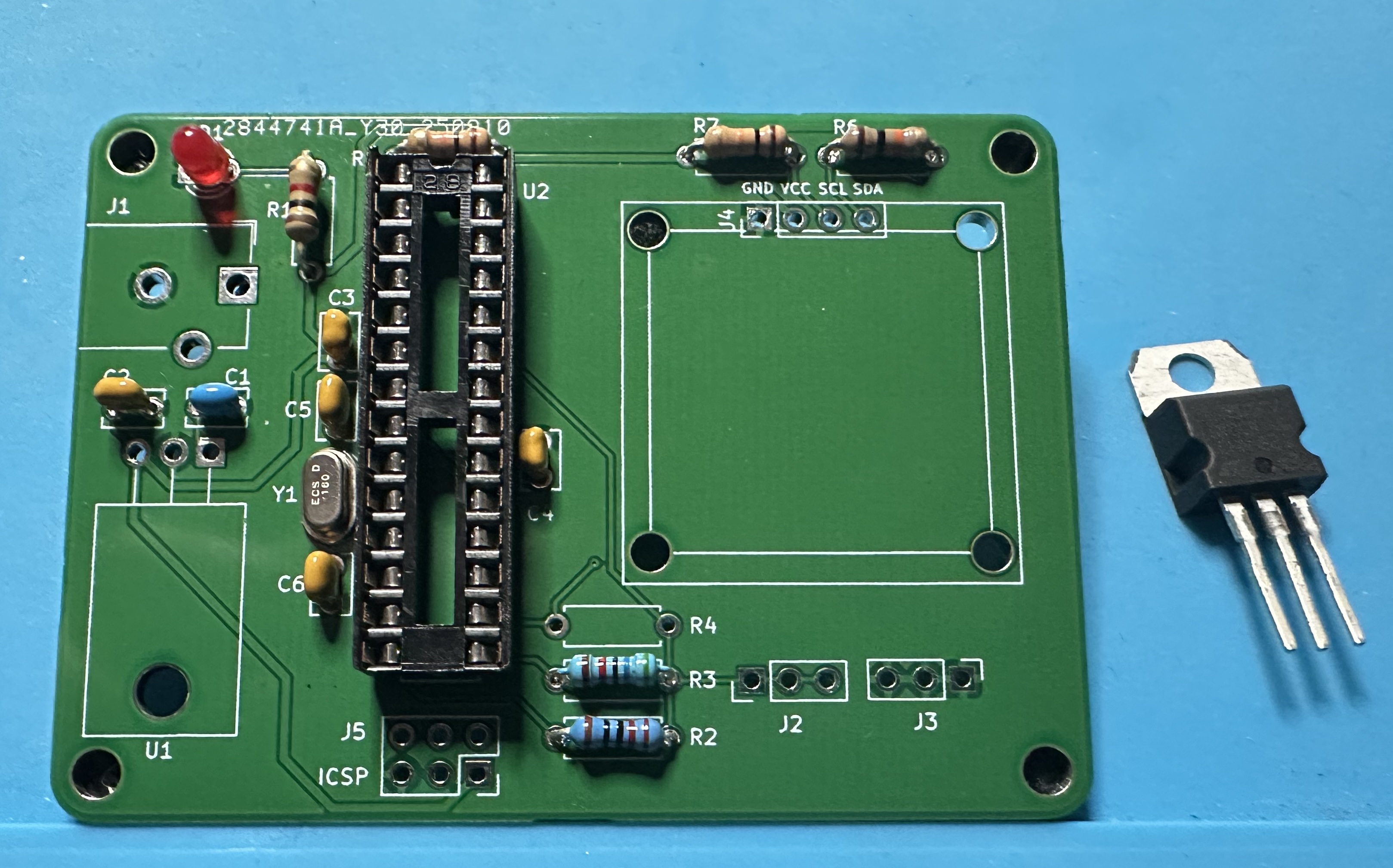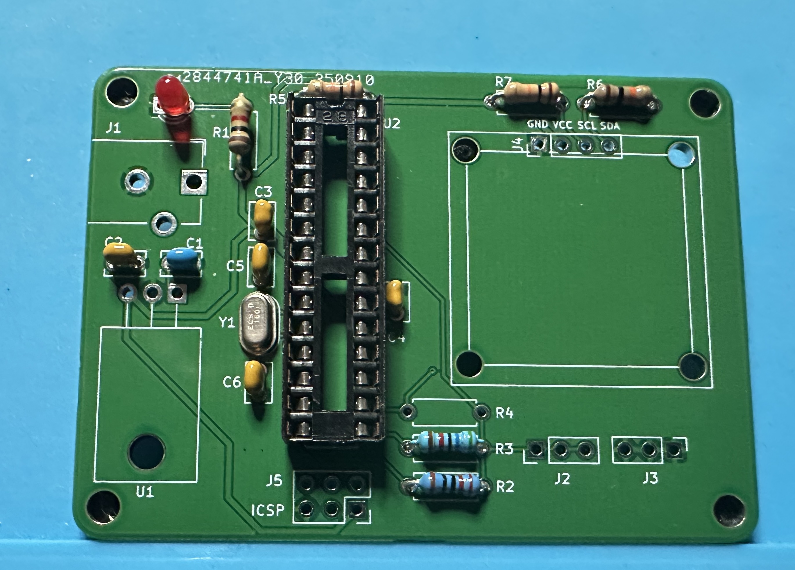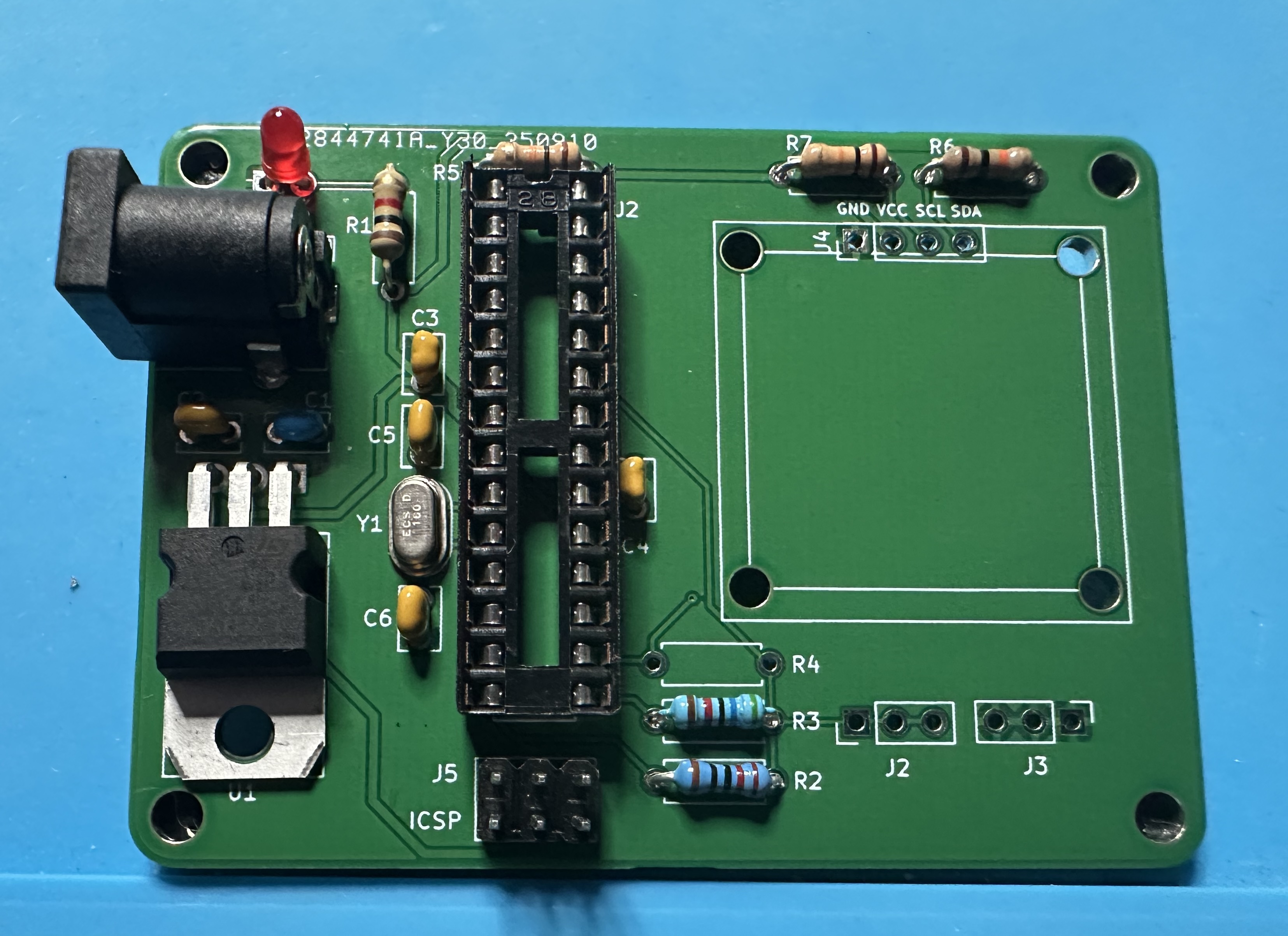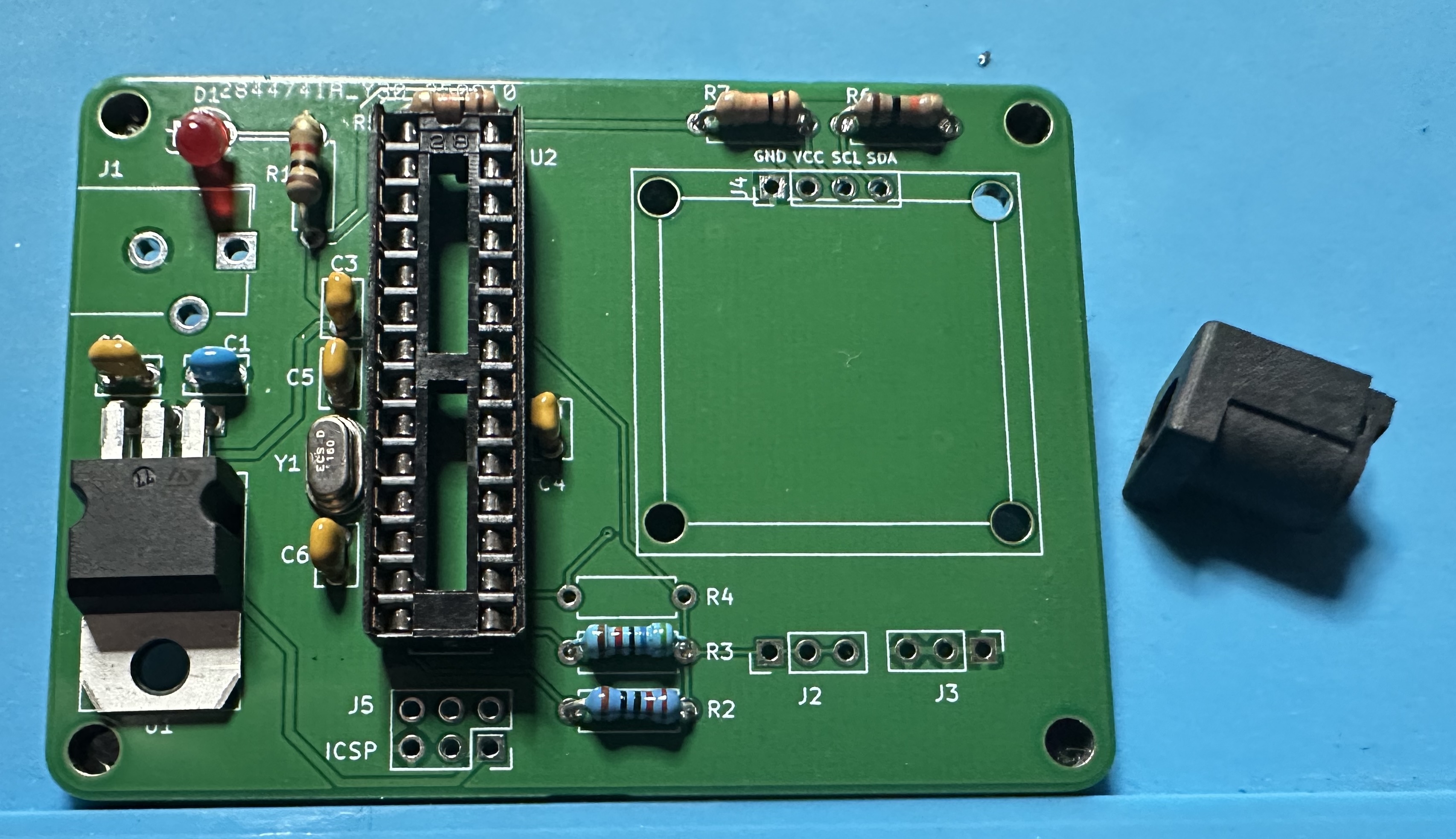 - Next up, add the chip socket — (U2) for the Atmega chip. This one is tedious — 28 pins. Solder one pin and check the alignment. Then take a deep breath and start soldering the other 27.