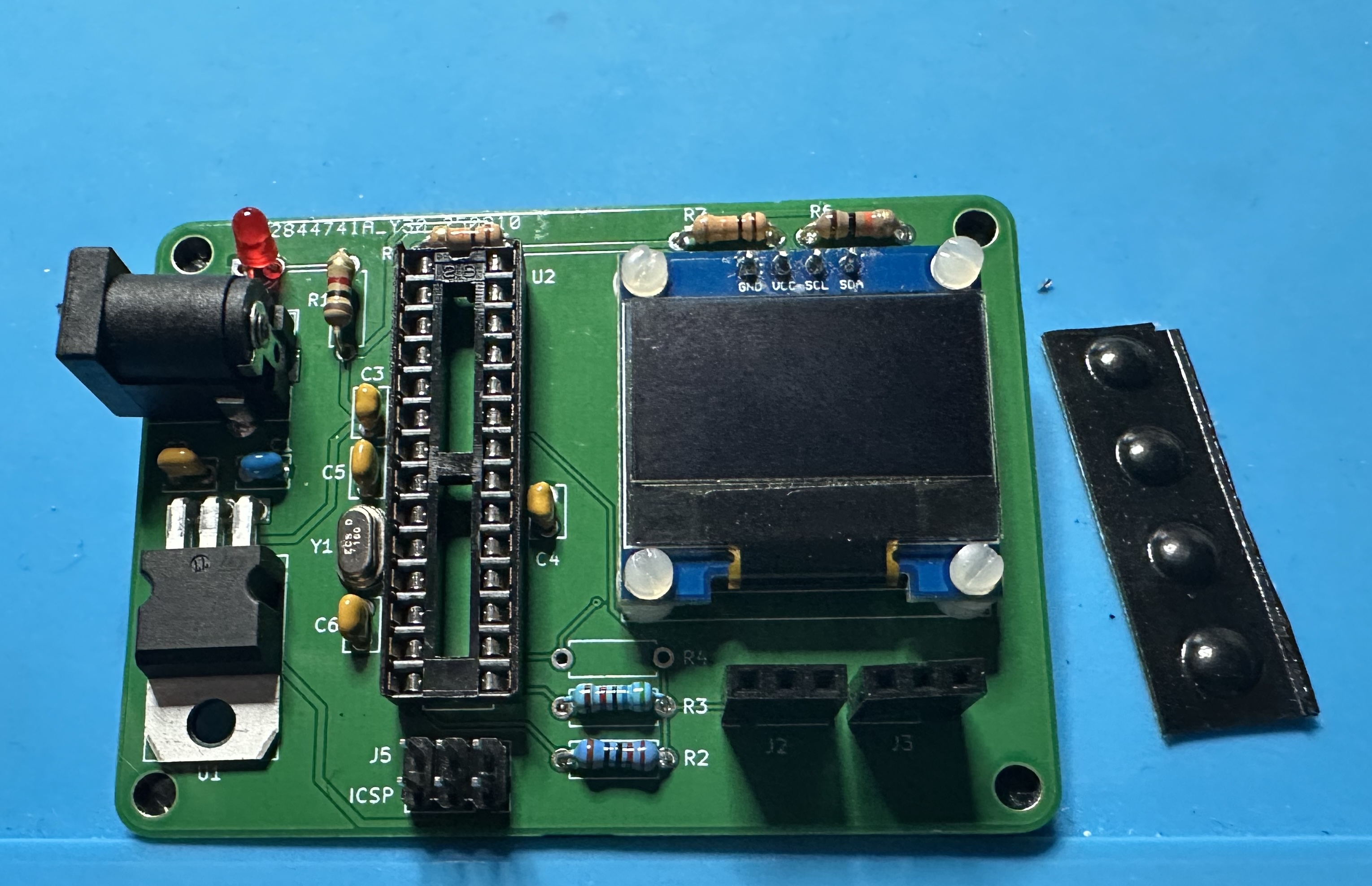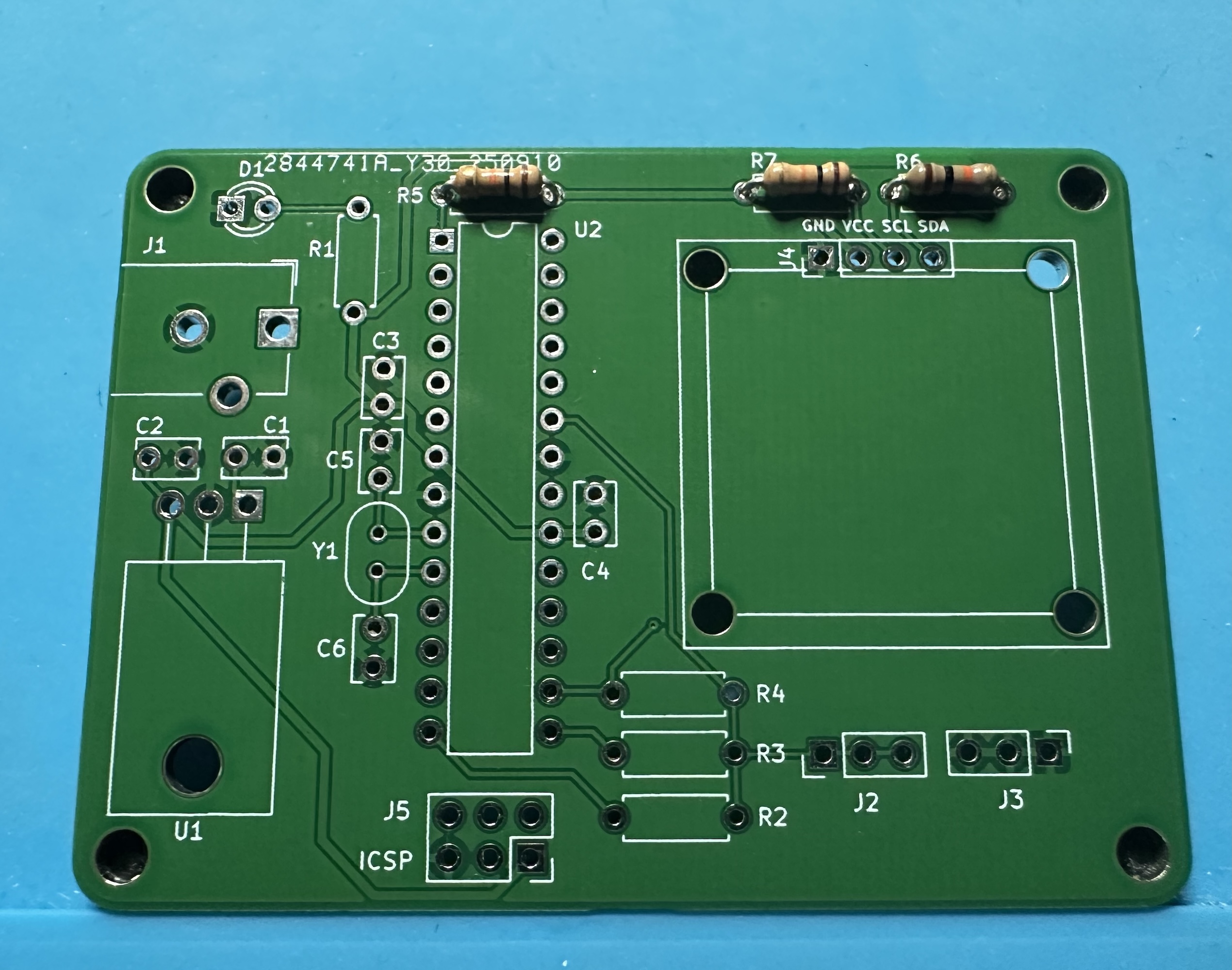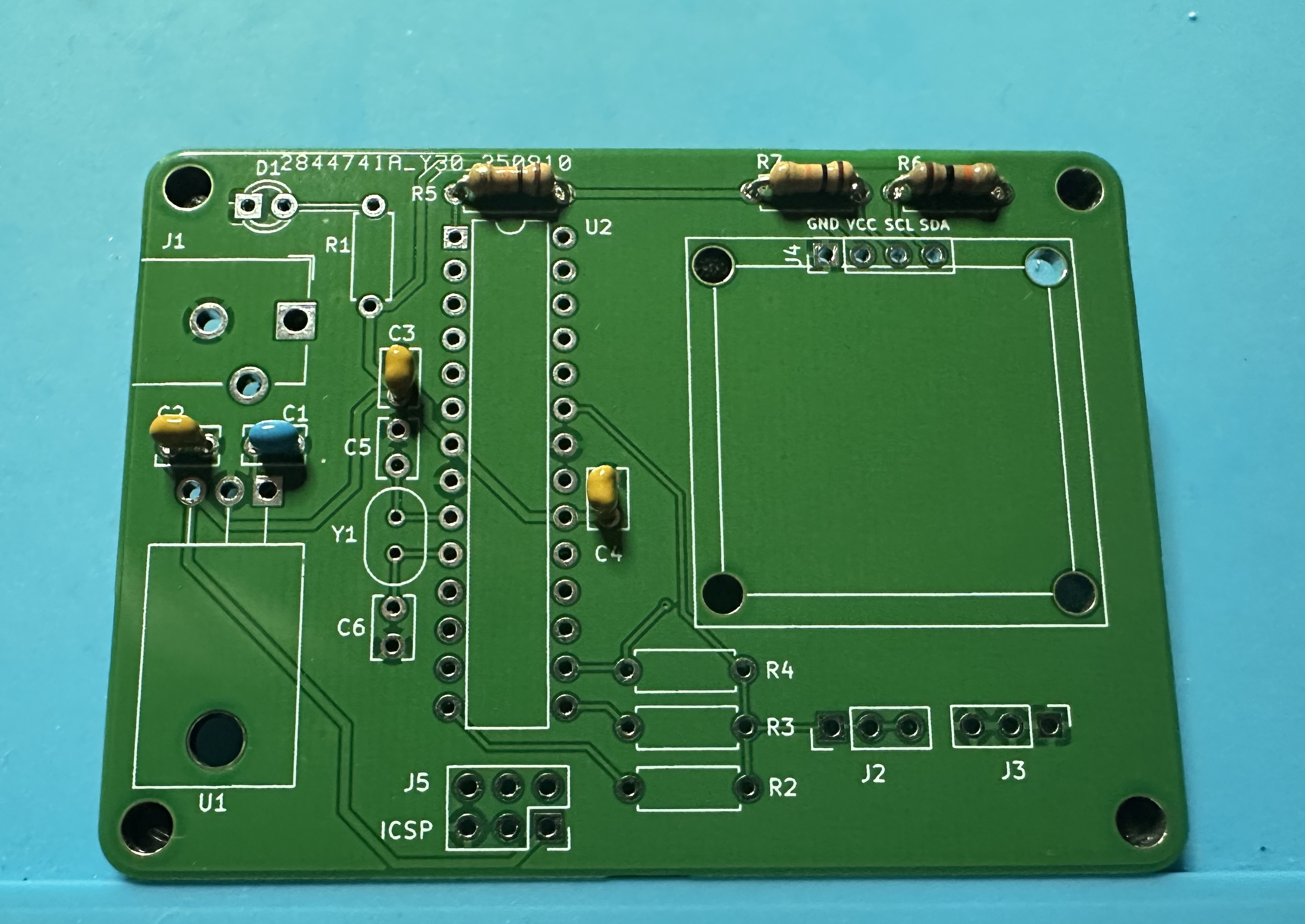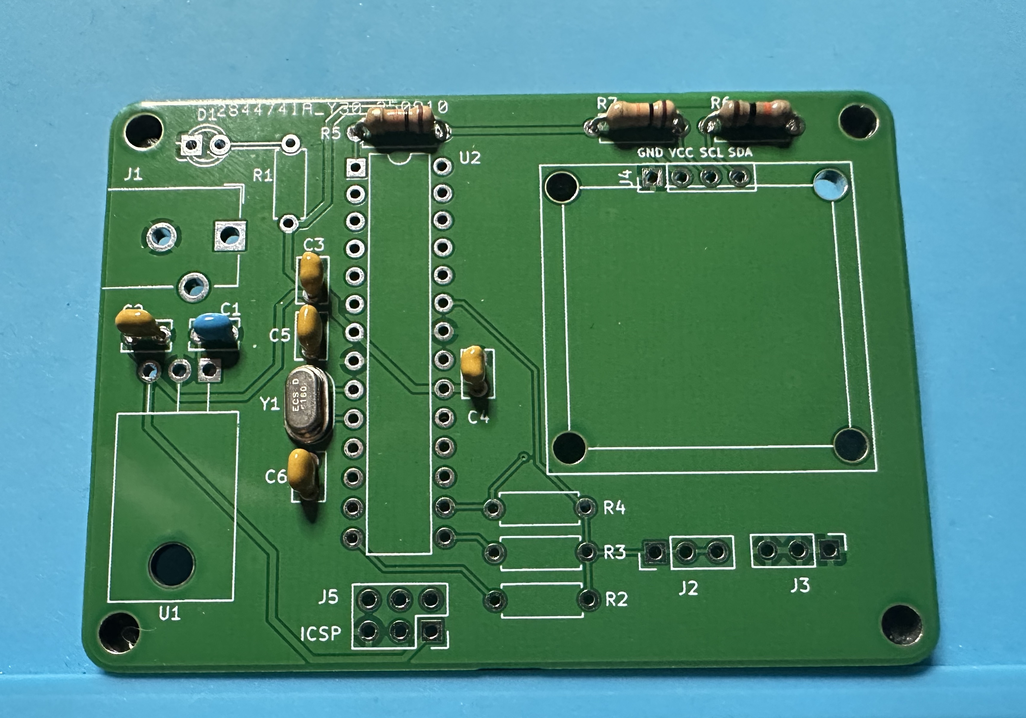 - Next up, add the chip socket — (U2) for the Atmega chip. This one is tedious — 28 pins. Solder one pin and check the alignment. Then take a deep breath and start soldering the other 27.