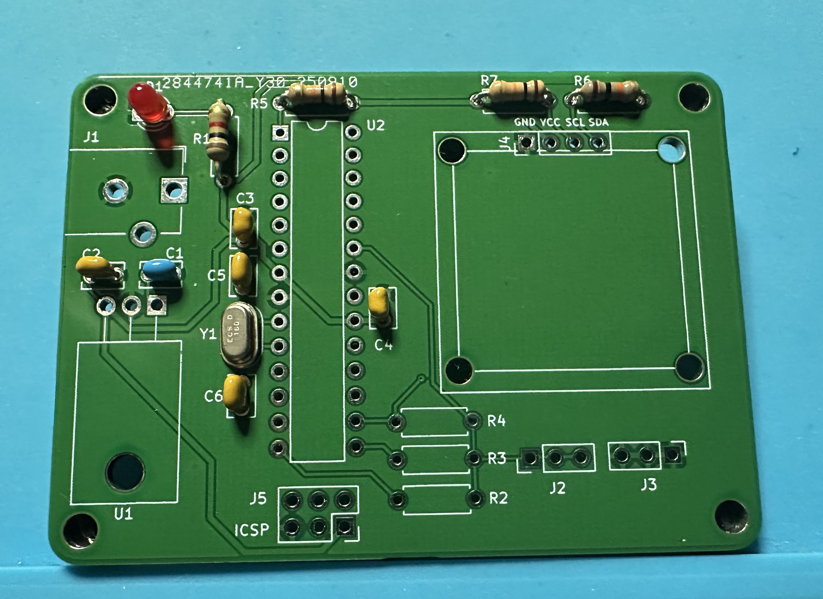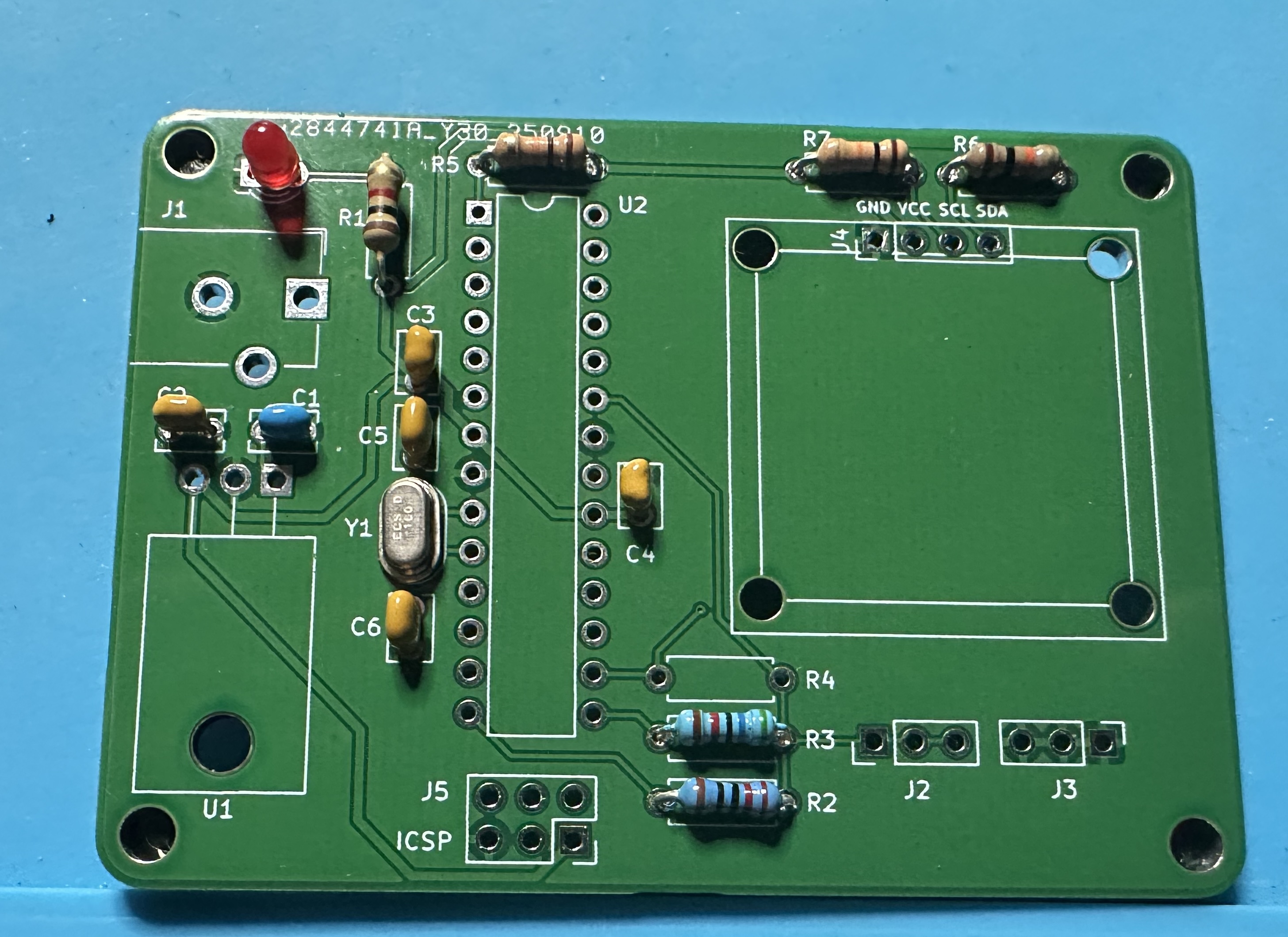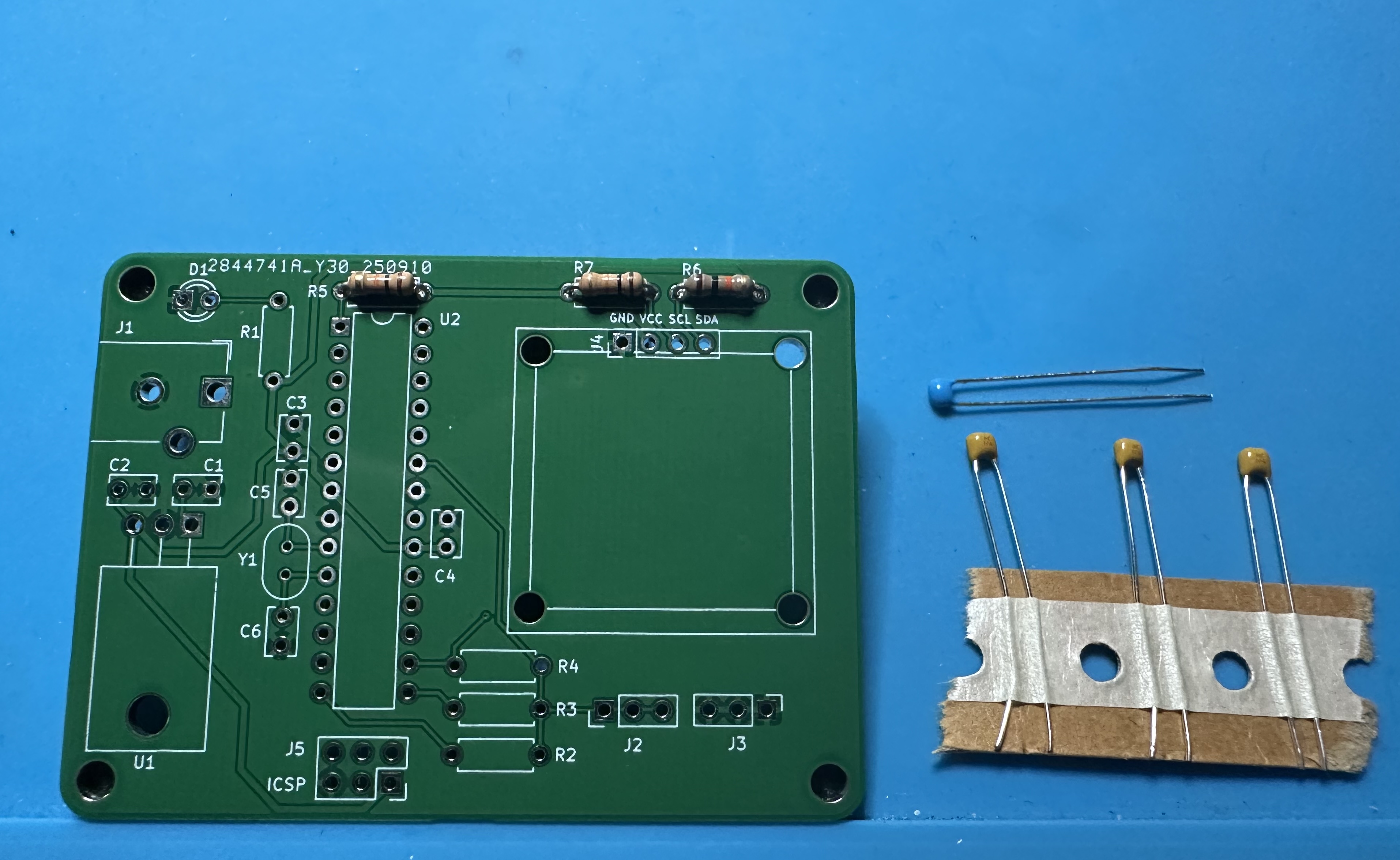 - Now, let's do the 16-MHz oscillator crystal (Y1) for the microcontroller and associated 22-pF (22J) capacitors (C5 and C6).