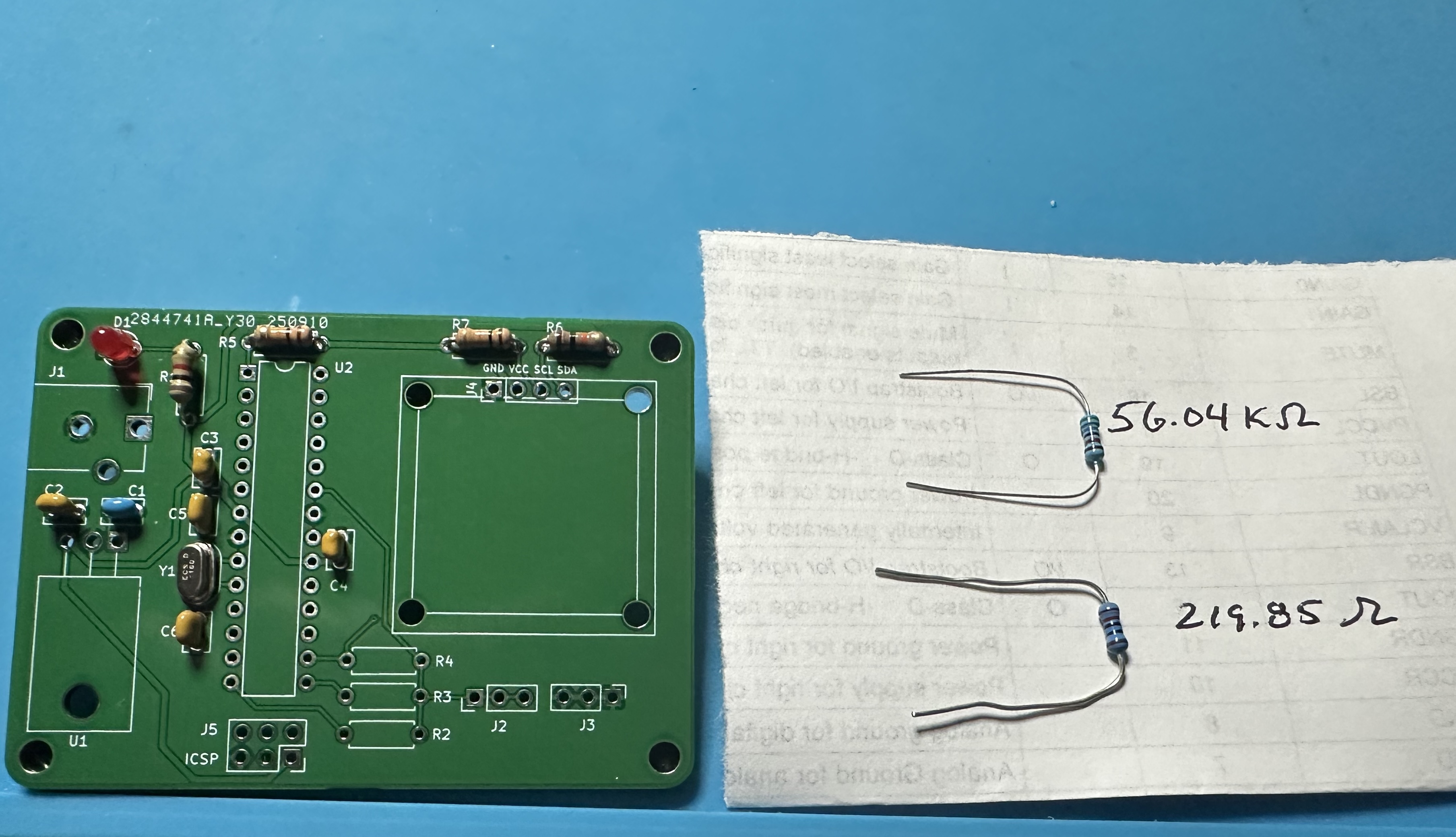 - Now add the two 1% resistors that are used for the voltage-divider measurement. They have a blue color and are hard to read. (220-Ω = red red black black and 56kΩ = green blue black red).It might be a good to measure them with the ohm-meter in the lab, so that you know which is which. Also, you can enter the measured values into the sketch and give a slight improvement to the measurements. The 220-Ω resistor is R2 and the 56kΩ resistor is R3. (Nothing goes into R4.) -