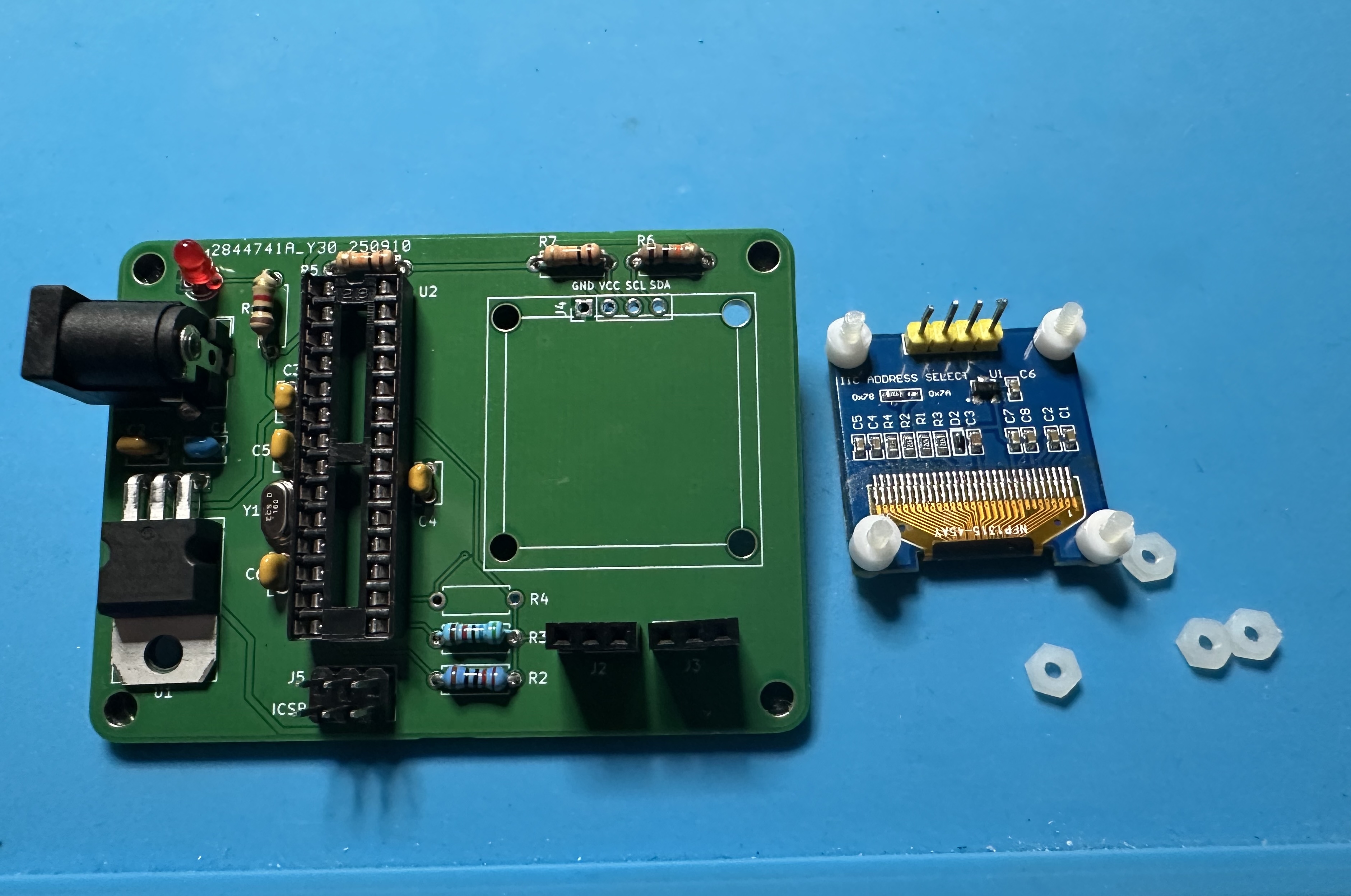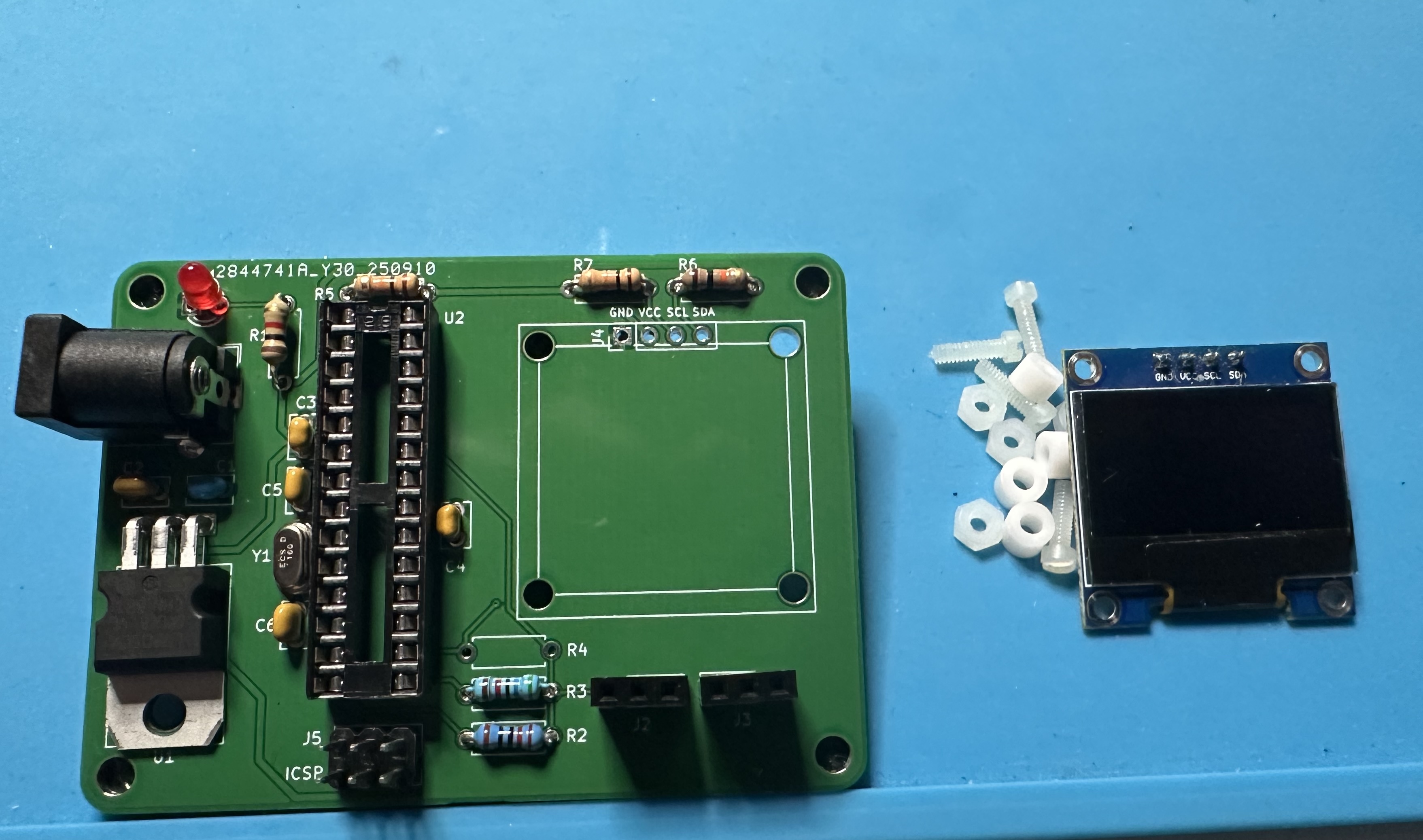 - Home stretch! Attach the OLED display and solder it in place. Suggested approach: Push all four of the nylon screws through the holes. It's a tight fit and you will need to apply a bit of force to get the screws through. (It will be OK!) The turn the display over and put the four spacers on the screws. Next turn the PCB over and insert it onto the display. Thread on the four nuts and use a screw driver to tighten everything up. Finally, solder in the four pins for the display.