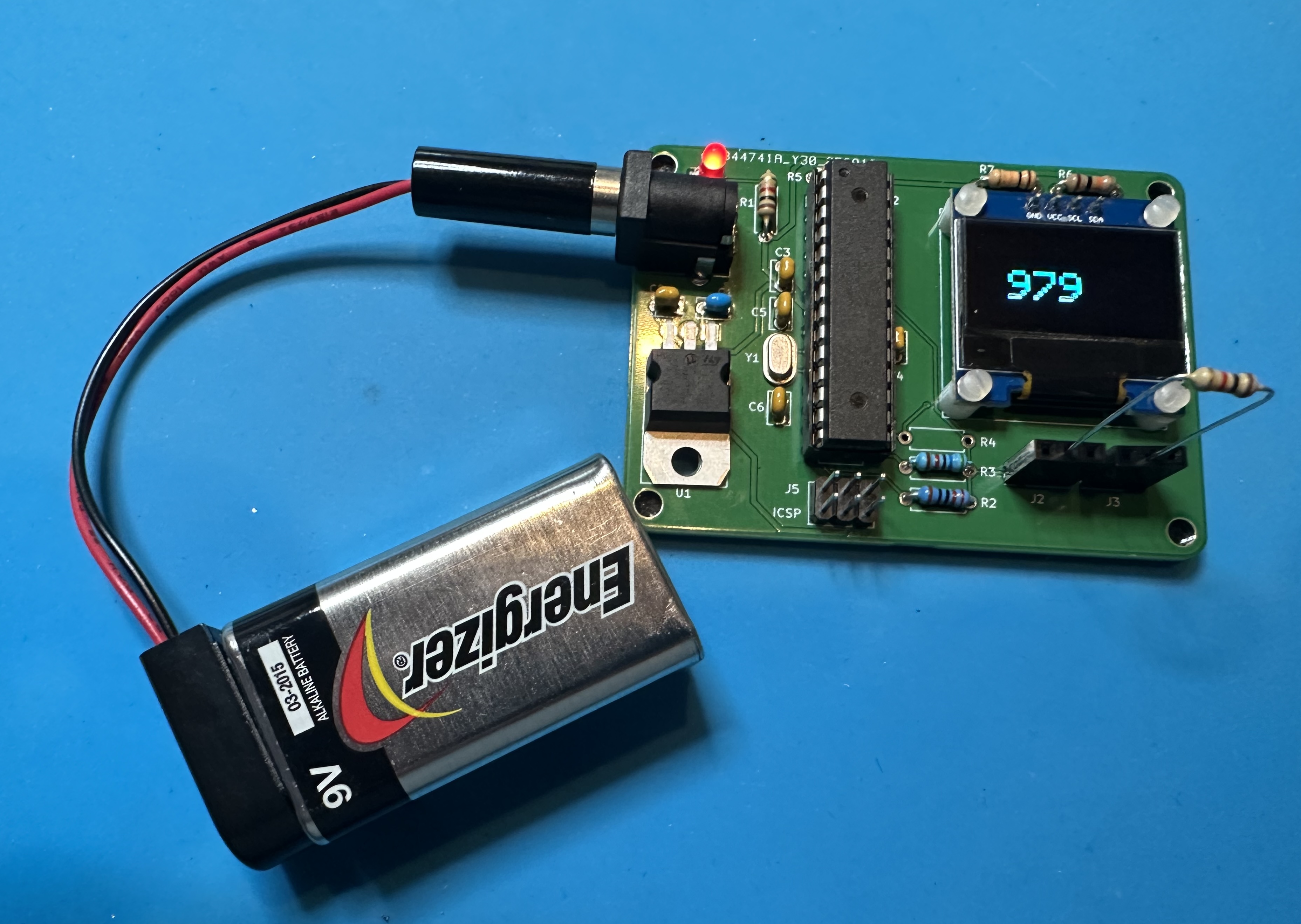 - To finish up, insert the Atmega328 chip into the socket. You can program before installing or after, using the ICSP header. You will probably have to fiddle with the leads, bending them in a bit so that all leads fit into the socket. Don't force it! Once the chip is programmed, attach a battery and start measuring resistors!